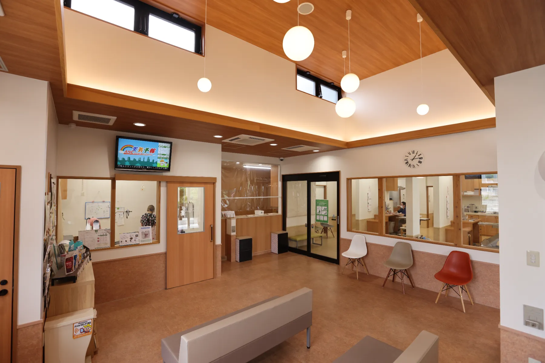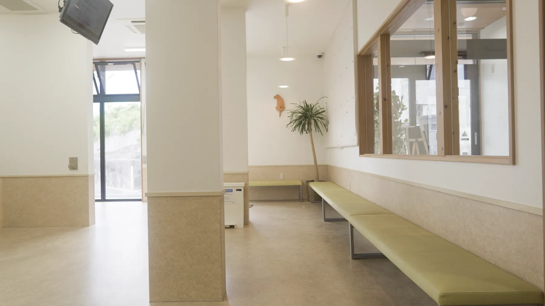 待合室は「外待合」と「中待合」にガラスで仕切られています。外待合は吹き抜けで天井が高く、ゆったりとした空間になっています。診察の方は、受付を済ませましたら中待合へとお進みください。