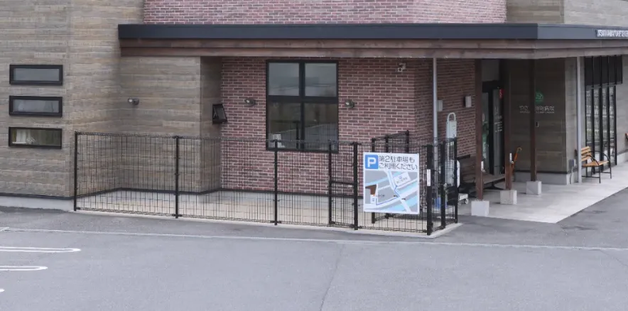 屋外の待合としてご利用いただける簡易ドッグランです。外待合の窓から院内の様子が見えるので安心してお待ちいただけます。