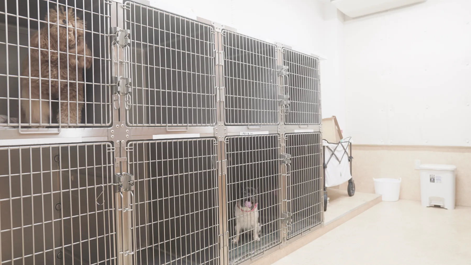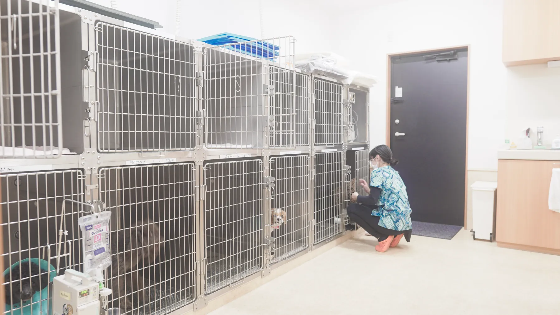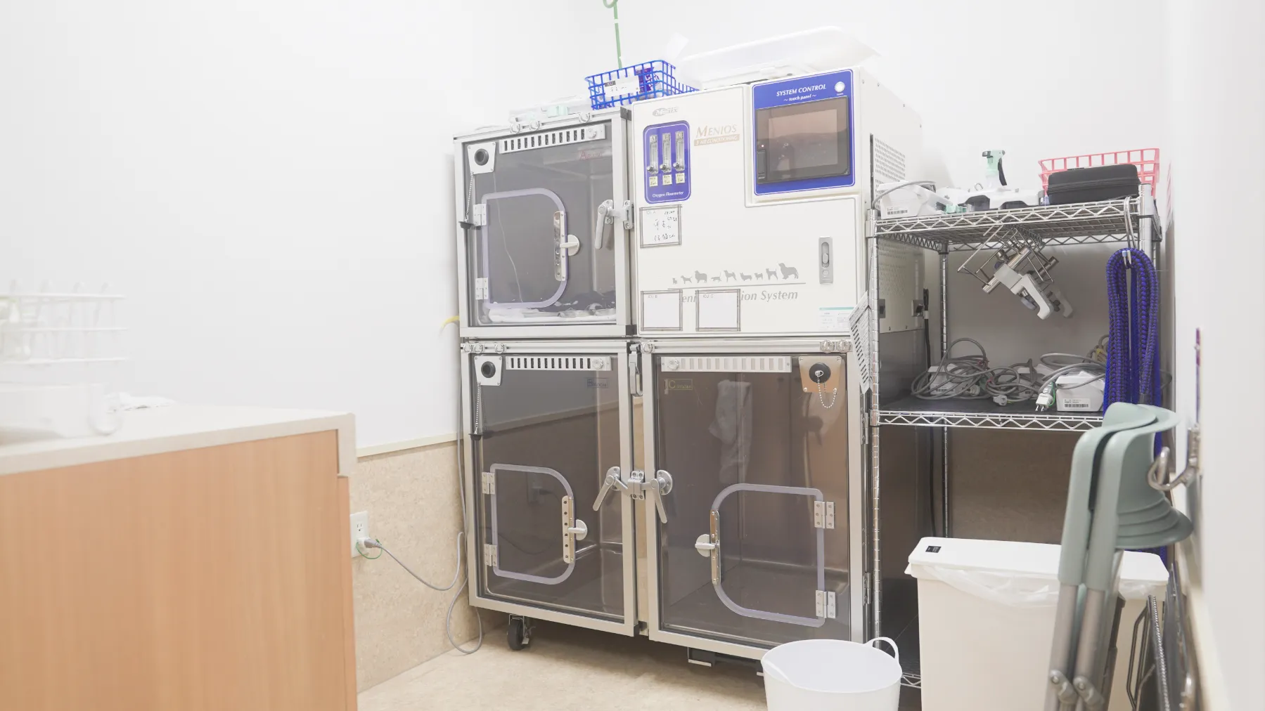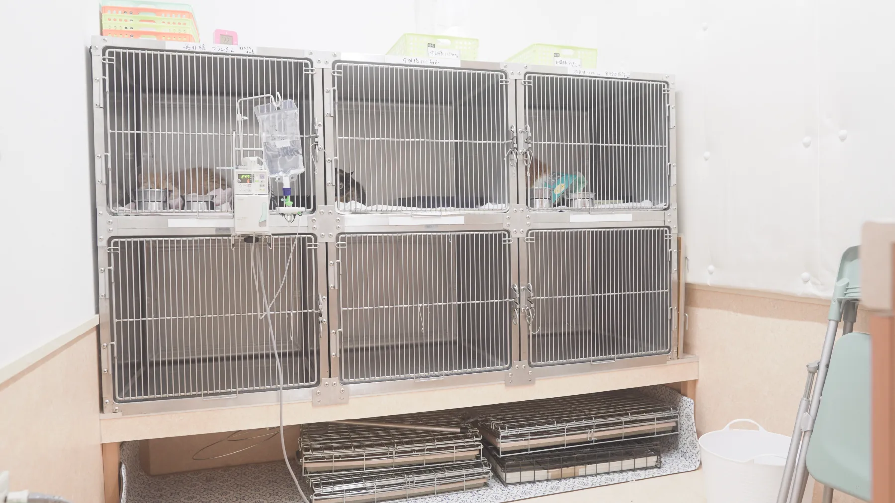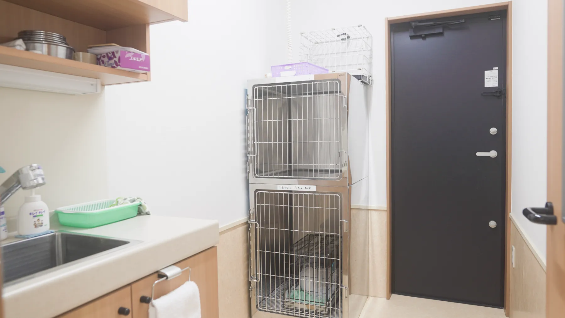 集中治療ケージを配した専用室です。処置室側から常に目が届き、重篤な症状の子を安静な環境の中で見守れるようガラスドアで仕切られています。